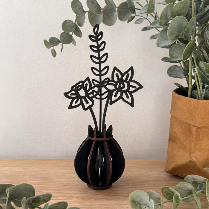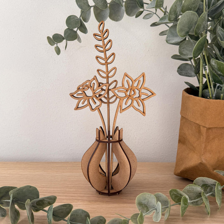 Deze set bestaat uit 2 narcissen en een takje lavendel. Deze mooie bloemen hoeven geen water en blijven dus mooi! ook als je geen groene vingers hebt. Het bloemensetje is inclusief vaasje.Het vaasje kan je makkelijk in elkaar zetten. Bekijk hier de instructie video Hoogte: ~28cmDe bloemetjes kunnen nog een beetje ruiken naar het gebrande hout.