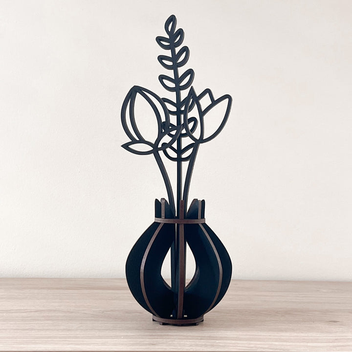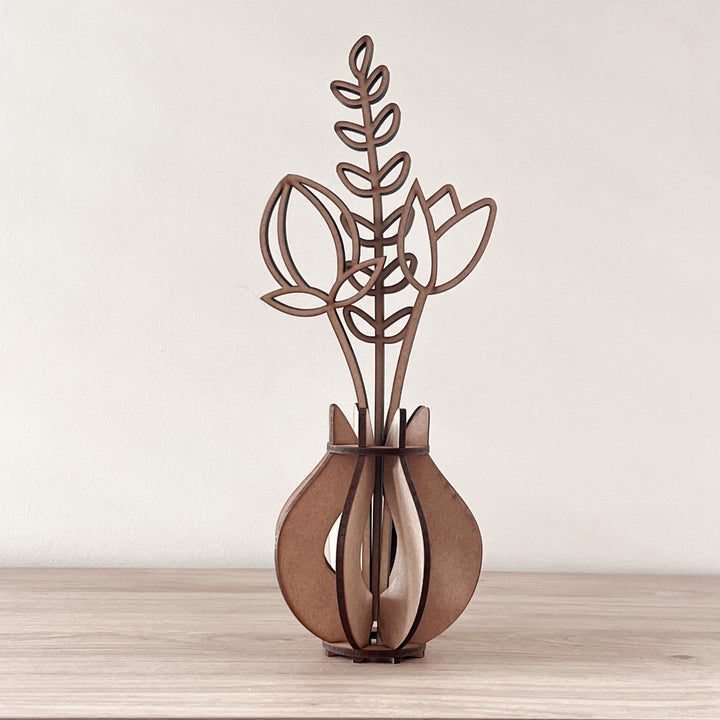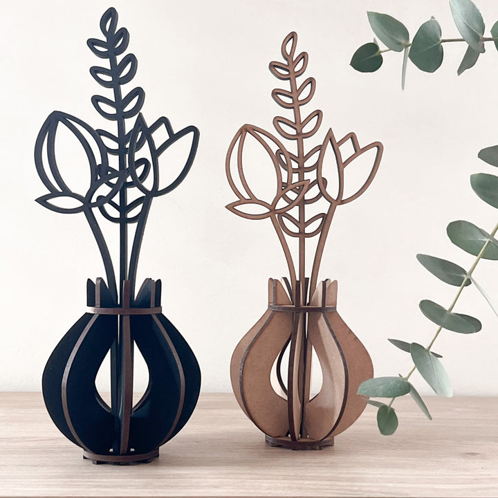 Deze set bestaat uit een Tulp, wilde bloem en een takje lavendel. Deze mooie bloemen hoeven geen water en blijven dus mooi! ook als je geen groene vingers hebt. Het bloemensetje is inclusief vaasje.Het vaasje kan je makkelijk in elkaar zetten. Bekijk hier de instructie video Hoogte: ~28cmDe bloemetjes kunnen nog een beetje ruiken naar het gebrande hout.