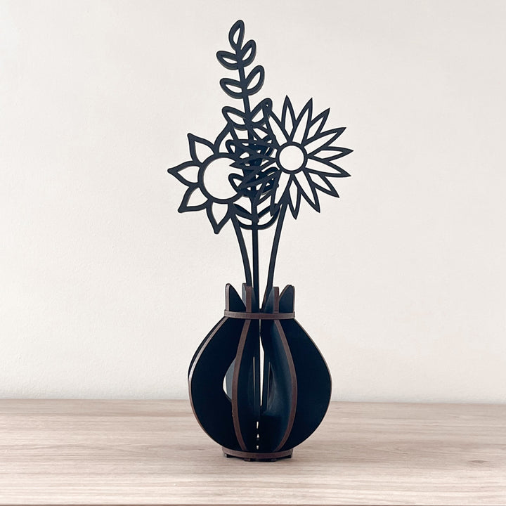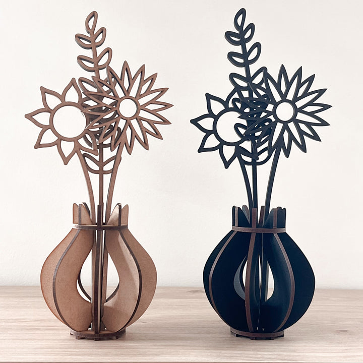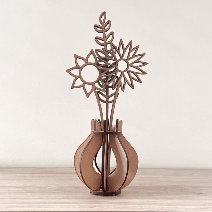 Deze set bestaat uit een Zonnebloem, Gerbera en een takje lavendel. Deze mooie bloemen hoeven geen water en blijven dus mooi! ook als je geen groene vingers hebt. Het bloemensetje is inclusief vaasje.Het vaasje kan je makkelijk in elkaar zetten. Bekijk hier de instructie video Hoogte: ~28cmDe bloemetjes kunnen nog een beetje ruiken naar het gebrande hout.