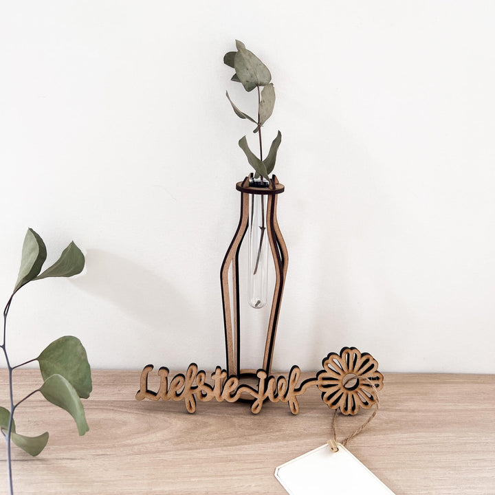Dit vaasje is gemaakt van hout en heeft een reageerbuisje in het midden waar een echt plantje in gezet kan worden. Door het open design van dit vaasje zie je goed het reageerbuisje zitten.