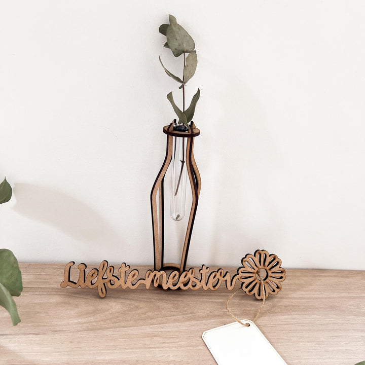 Dit vaasje is gemaakt van hout en heeft een reageerbuisje in het midden waar een echt plantje in gezet kan worden. Door het open design van dit vaasje zie je goed het reageerbuisje zitten. Het takje (eucalyptus) dat je in het vaasje ziet zitten wordt niet meegeleverd. Het vaasje is erg makkelijk zelf in elkaar te zetten, hiervoor kan je deze instructie video gebruiken. De afmeting van het vaasje is: +-17,5cm hoog en +-5cm breed Je kan bij dit pakket kiezen uit de volgende wensbloemen: - Liefste juf- Liefste meester