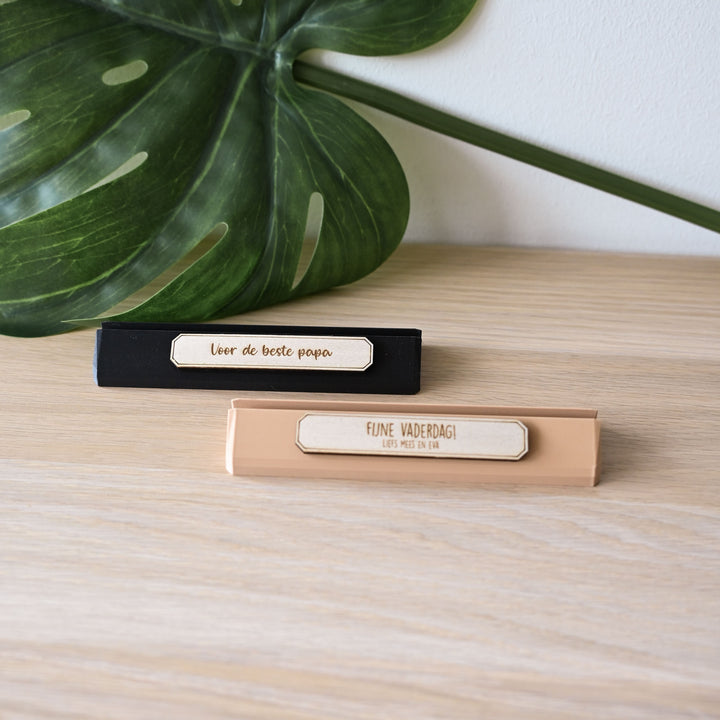 Het blokje om de decoratie in te zetten wordt meegeleverd. Het is mogelijk om hier tegen meerprijs een tekst op te zetten zoals bijvoorbeeld "Fijne vaderdag! xx Max en Sophie".