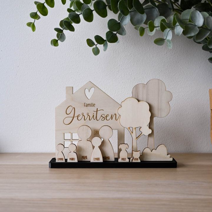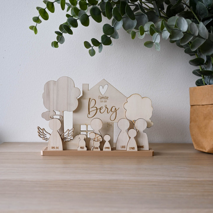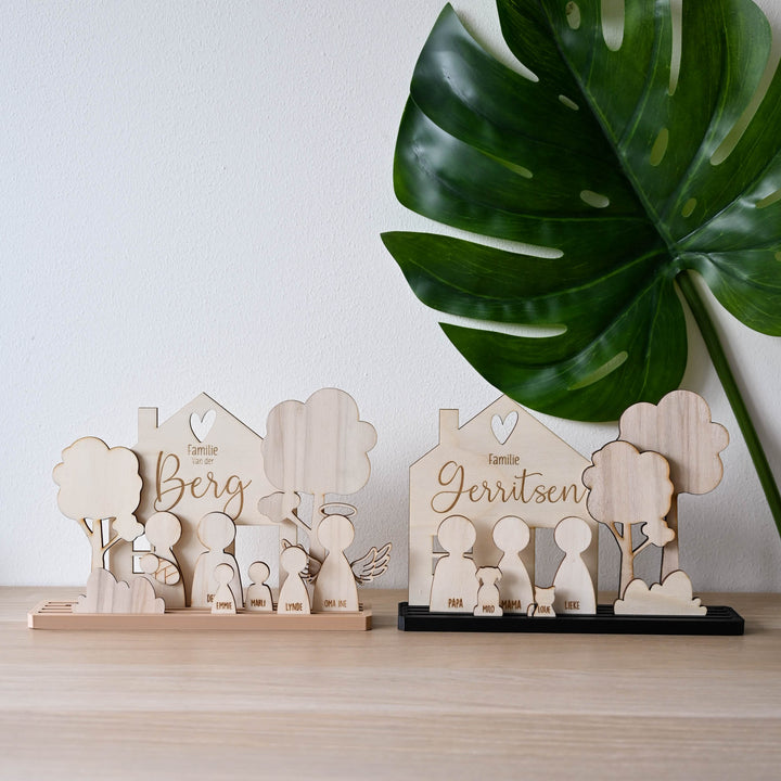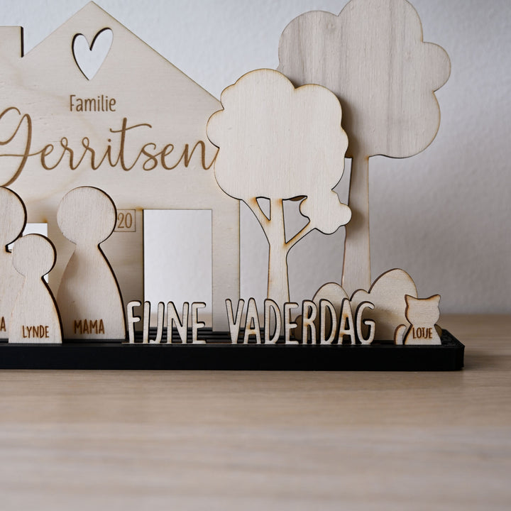 Maak een unieke decoratie van je eigen gezin. Je krijgt standaard de basis plaat, huisje, 2 bomen en een struik. Nu met gratis "Fijne vaderdag" tekst