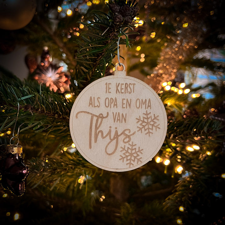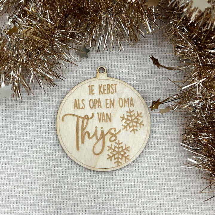 Bij deze kerstbal kan je zelf de naam invullen. De naam heeft een maximale lengte van 13 tekens.Deze kerstbal is gemaakt van 3mm dik berken hout en weegt daarom bijna niks, hierdoor gaan de takken van de kerstboom niet hangen. Er zit ruimte aan de bovenkant om zelf een kerstboom hanger of touwtje doorheen te doen. De kerstbal kan zelf nog geverfd worden.Aan de achterkant kunnen wat lichte brandplekken zitten. Afmeting: 7,8cm breed, 8,8cm hoog