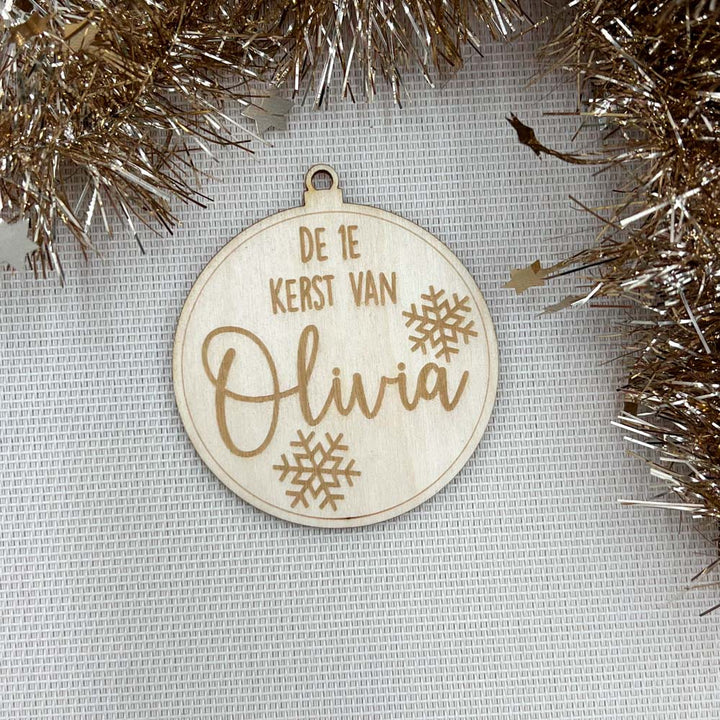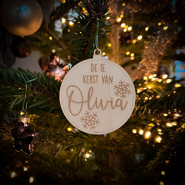 Bij deze kerstbal kan je zelf de naam invullen. De naam heeft een maximale lengte van 13 tekens.Deze kerstbal is gemaakt van 3mm dik berken hout en weegt daarom bijna niks, hierdoor gaan de takken van de kerstboom niet hangen. Er zit ruimte aan de bovenkant om zelf een kerstboom hanger of touwtje doorheen te doen. De kerstbal kan zelf nog geverfd worden.Aan de achterkant kunnen wat lichte brandplekken zitten. Afmeting: 7,8cm breed, 8,8cm hoog