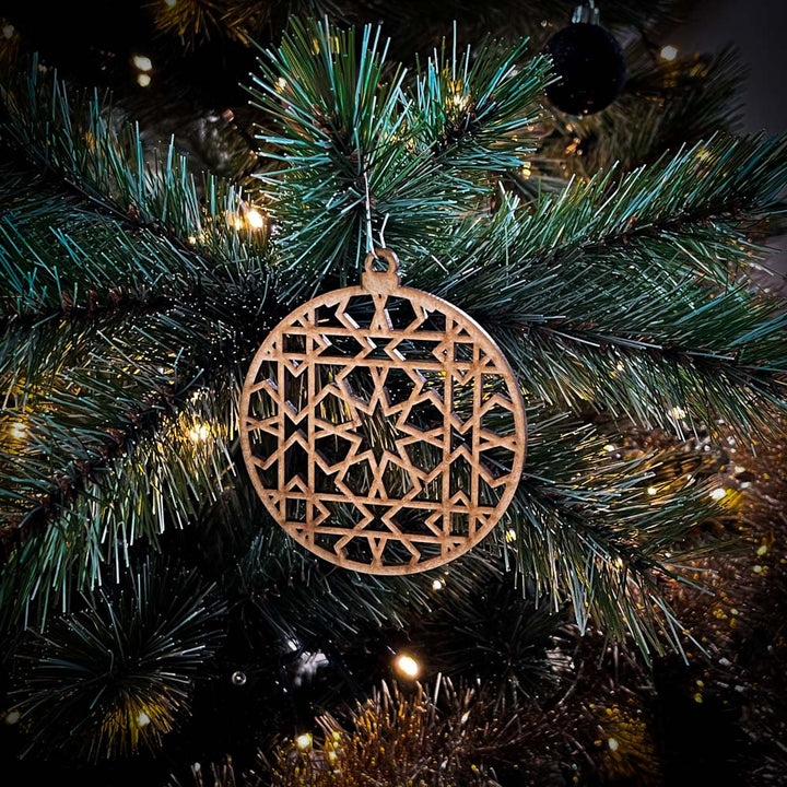 Deze kerstbal is gemaakt van 3mm dik hout en weegt daarom bijna niks, hierdoor gaan de takken van de kerstboom niet hangen. Er zit ruimte aan de bovenkant om zelf een kerstboom hanger of touwtje doorheen te doen.