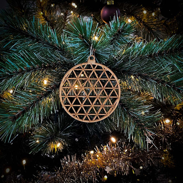 Deze kerstbal is gemaakt van 3mm dik hout en weegt daarom bijna niks, hierdoor gaan de takken van de kerstboom niet hangen. Er zit ruimte aan de bovenkant om zelf een kerstboom hanger of touwtje doorheen te doen.