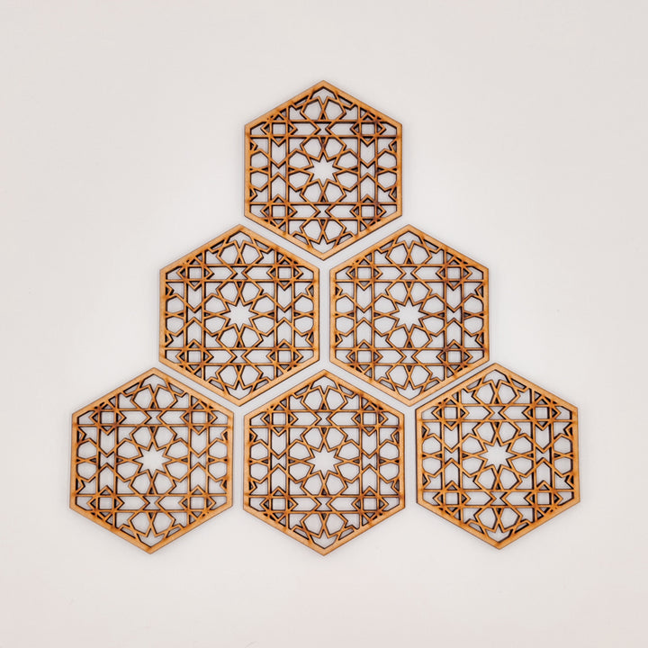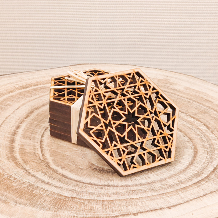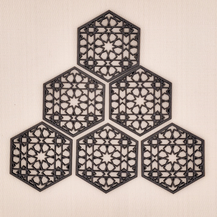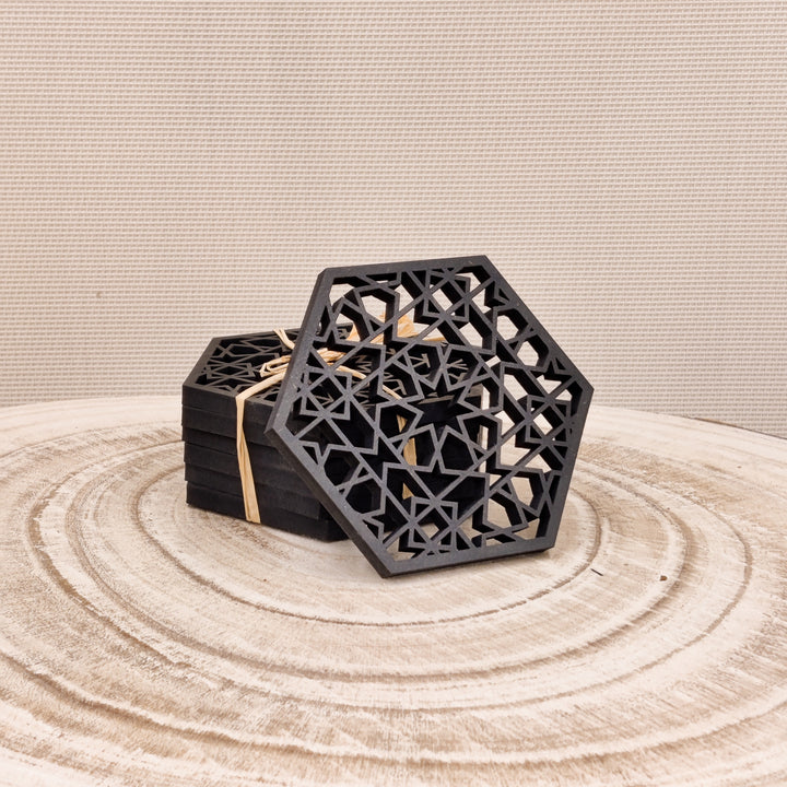 Een setje onderzetters bestaat uit 6 stuks. Ze hebben een open design en zijn behandeld zodat ze tegen water en warmte kunnen. Ze kunnen niet in de vaatwasser. Afmeting is 10cm bij 9cm